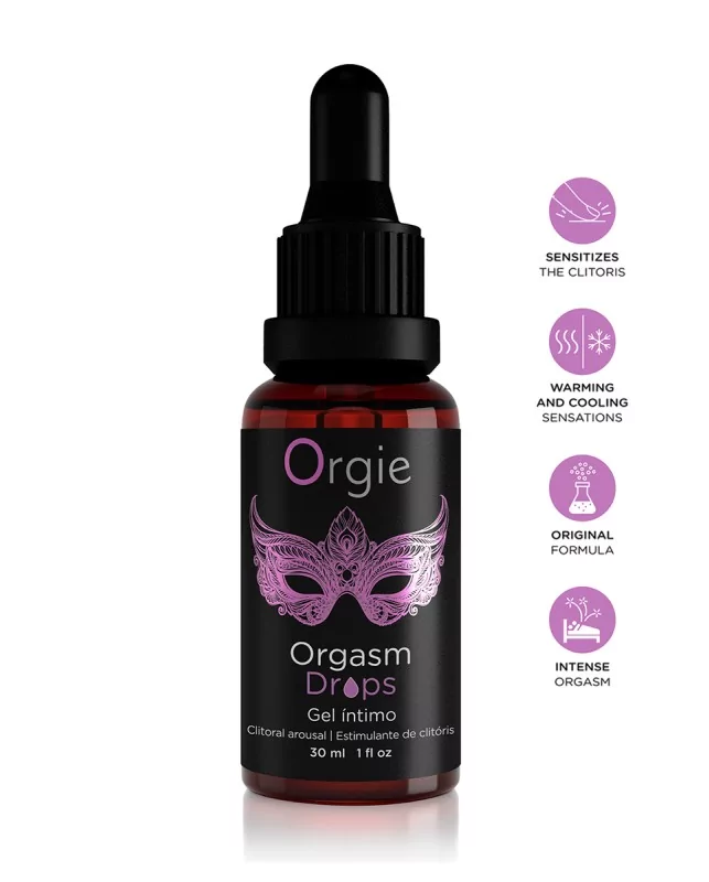 "Orgasm Drops Clitoral Arousal Intimate Gel" est un gel intime d'excitation du clitoris, avec effets chauffants et rafraichissants, de la marque de cosmétique érotique Orgie.