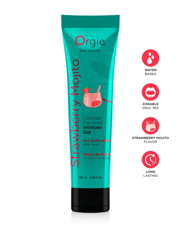 Gel intime Orgie à base deau, embrassable, longue durée, au goût De Cocktail fraise Mojito, en tube de 100ml.